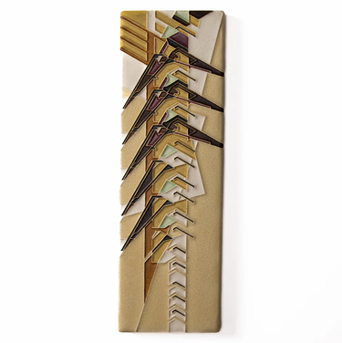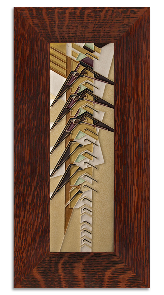 Frank Lloyd Wright (1867–1959) is recognized worldwide as one of the greatest architects of the 20th century. Wright’s John and Catherine Christian House, also known as Samara (named after a pinecone’s winged seeds), was completed in West Lafayette, Indiana, toward the end of his illustrious career. The samara seed pattern appears on Wright’s perforated board design for the house, and perhaps most prominently on a rug commissioned by Professor Christian in the 1990s and designed by Taliesin’s Aris Georges and Cornelia Brierly. That rug was the inspiration for Motawi Tileworks’ 4x12 Samara art tile, which reinterprets Wright’s pattern once again in ceramic.