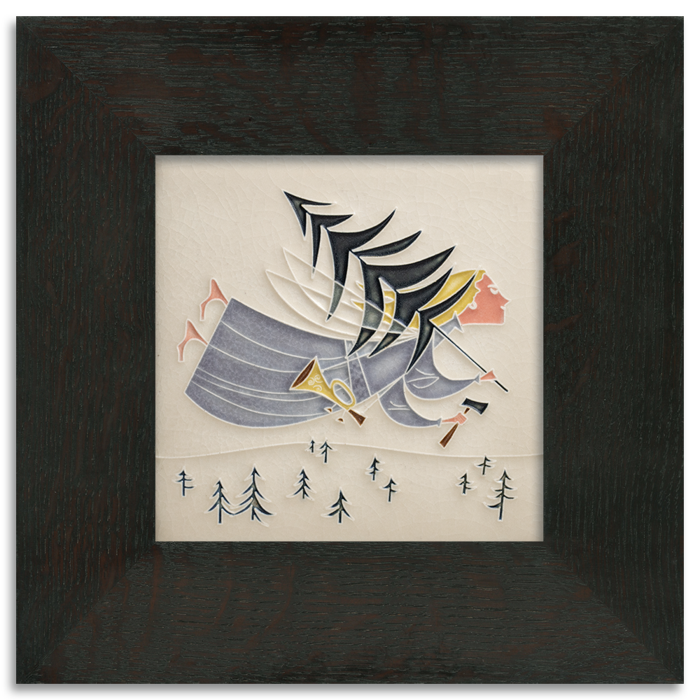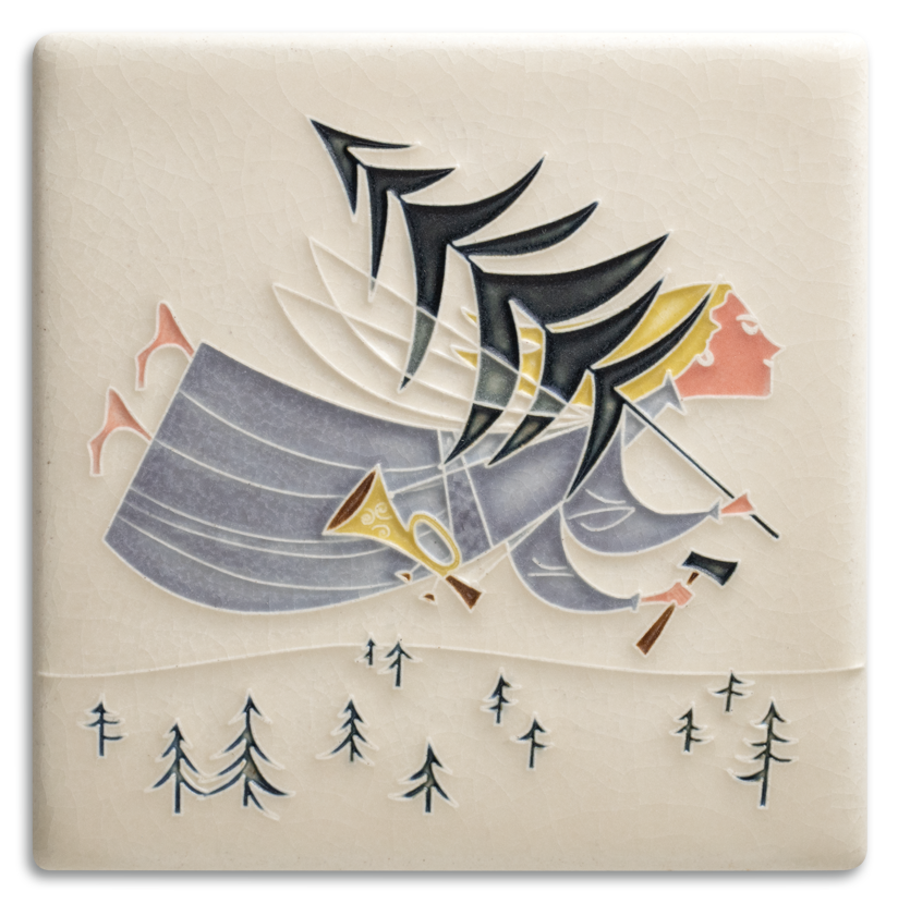 Based on Harper's print Christmas Spirit Fir-Ever, this scene depicts the spirit of Christmas flying over a snowy landscape with a freshly cut tree. During the prototyping process this snowy scene earned the nickname, "Christmas Witch". She may be serene but she means business!